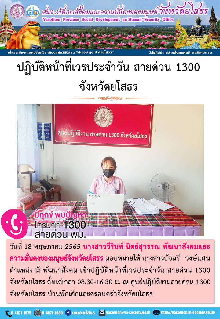 ปฏิบัติหน้าที่เวรประจำวันสายด่วน 1300 จังหวัดยโสธร (18 พฤษภาคม 2565)