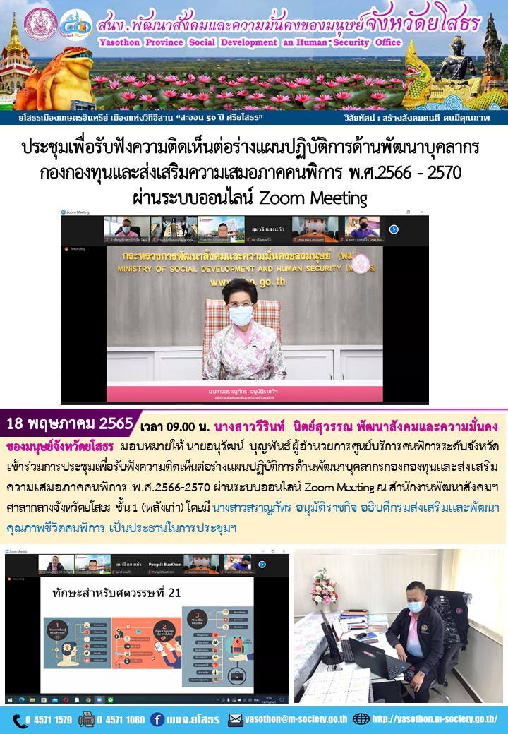 วันที่ 30 พ.ค. 2565 (21:05 น.)วันที่ 18 พฤษภาคม 2565 เวลา 09.00 น. นางสาววีรินท์ นิตย์สุวรรณ พัฒนาสังคมและความมั่นคงของมนุษย์จังหวัดยโสธร มอบหมายให้ นายอนุวัฒน์ บุญพันธ์ ผู้อำนวยการศูนย์บริการคนพิการระดับจังหวัด เข้าร่วมการประชุมเพื่อรับฟังความติดเห็นต่อร่างแผนปฏิบัติการด้านพัฒนาบุคลากรกองกองทุนเละส่งเสริมความเสมอภาคคนพิการ พ.ศ.2566-2570 ผ่านระบบออนไลน์ Zoom Meeting ณ สำนักงานพัฒนาสังคมฯ ศาลากลางจังหวัดยโสรร ชั้น 1 (หลังเก่า โดยมี นางสาวสราญกัทร นุมัติราชกิจ อธิบดีกรมส่งเสริมและพัฒนาคุณภาพชีวิตคนพิการ เป็นประธานในการประชุมฯ