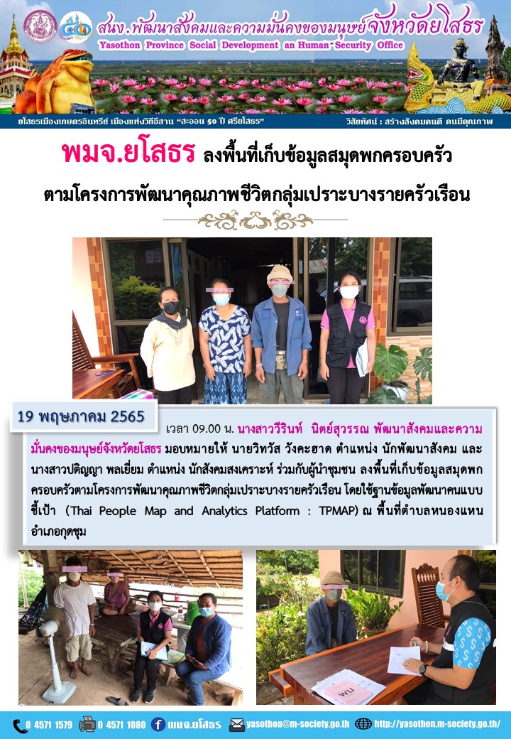 พมจ.ยโสธร ลงพื้นที่เก็บสมุดพกครอบครัวตามโครงการพัฒนาคุณภาพชีวิตกลุ่มเปราะบางรายครัวเรือน (19 พฤษภาคม 2565)