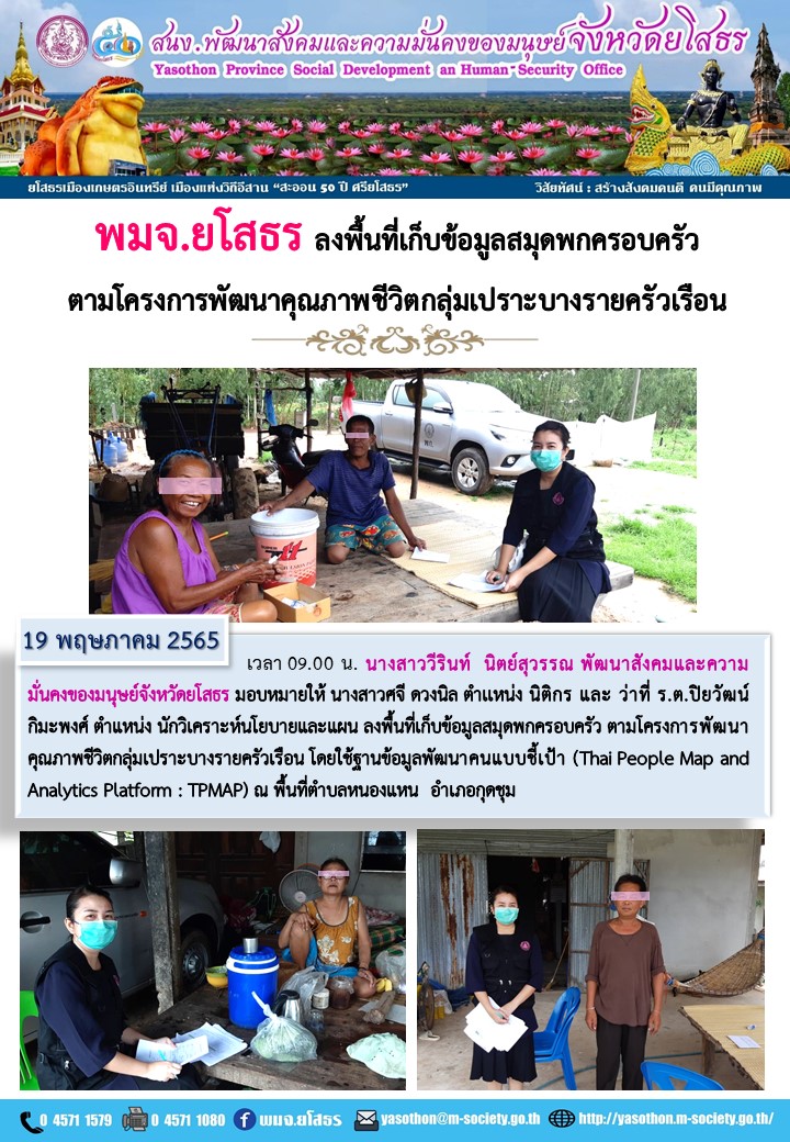 พมจ.ยโสธร ลงพื้นที่เก็บสมุดพกครอบครัวตามโครงการพัฒนาคุณภาพชีวิตกลุ่มเปราะบางรายครัวเรือน อำเภอกุดชุม (19 พฤษภาคม 2565)