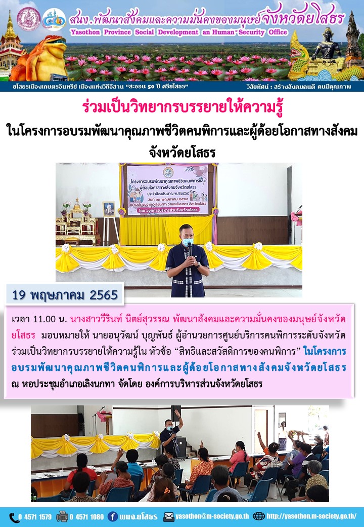 ร่วมเป็นวิทยากรบรรยายให้ความรู้ในโครงการอบรมพัฒนาคุณภาพชีวิตคนพิการและผู้ด้อยโอกาสทางสังคมจังหวัดยโสธร (19 พฤษภาคม 2565)