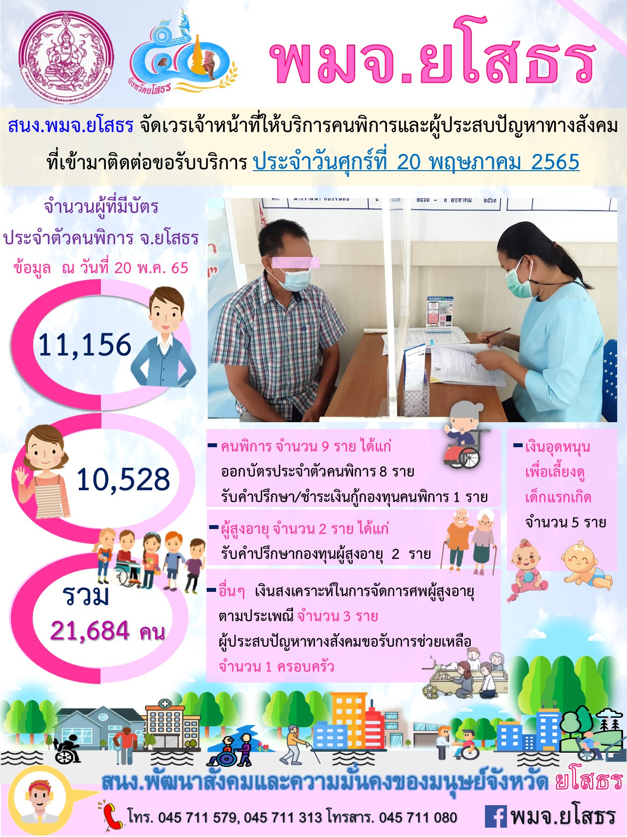 สนง.พมจ.ยโสธร จัดเวรเจ้าหน้าที่ให้บริการคนพิการและผู้ประสบปัญหาทางสังคม ที่เข้ามาติดต่อขอรับบริการ (20 พฤษภาคม 2565)