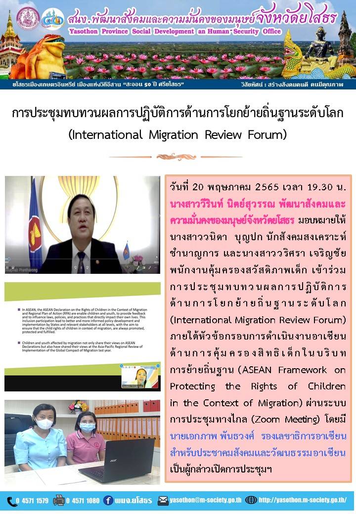 วันที่ 30 พ.ค. 2565 (21:40 น.)วันที่ 20 พฤษภาคม 2565 เวลา 19.30 น. นางสาววีรินท์ นิตย์สุวรรณ พัฒนาสังคมและความมั่นคงของมนุษย์จังหวัดยโสธร มอบหมายให้นางสาววนิดา บุญปก นักสังคมสงเคราะห์ ชำนาญการ และนางสาววริศรา เจริญชัยพนักงานคุ้มครองสวัสดิภาพเด็ก เข้าร่วมการประชุมทบทวนผลการปฏิบัติการด้านการโยกย้ายถิ่นฐานระดับโลก (International Migration Review Forum) ภายใต้หัวข้อกรอบการดำเนินงานอาเซียน ด้านการคุ้มครองสิทธิเด็กในบริบท การย้ายถิ่นฐาน (ASEAN Framework on Protecting the Rights of Children in the Context of Migration) ผ่านระบบการประชุมทางไกล (Zoom Meeting) โดยมี นายเอกภาพ พันธวงศ์ รองเลขาธิการอาเซียนสำหรับประชาคมสังคมและวัฒนธรรมอาเซียน เป็นผู้กล่าวเปิดการประชุมฯ