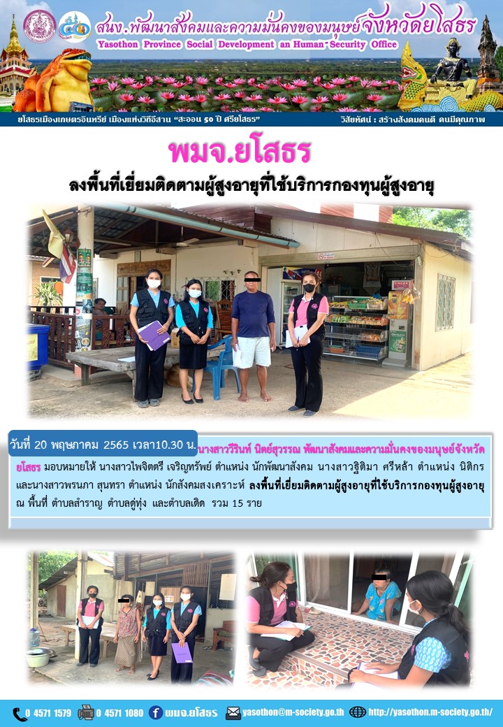 พมจ.ยโสธร ลงพื้นที่เยี่ยมติดตามผู้สูงอายุที่ใช้บริการกองทุนผู้สูงอายุ (20 พฤษภาคม 2565)