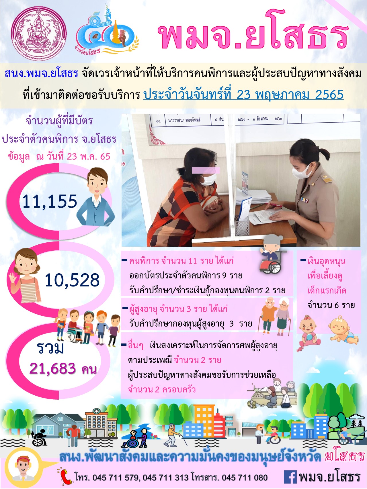สนง.พมจ.ยโสธร จัดเวรเจ้าหน้าที่ให้บริการคนพิการและผู้ประสบปัญหาทางสังคม ที่เข้ามาติดต่อขอรับบริการ (23 พฤษภาคม 2565)