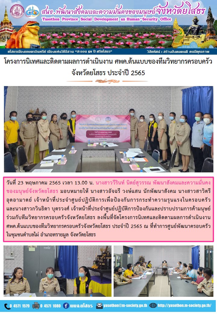 โครงการนิเทศและติดตามผลการดำเนินงาน ศพค.ต้นแบบของทีมวิทยากรครอบครัวจังหวัดยโสธร ประจำปี 2565 ณ ที่ทำการศูนย์พัฒนาครอบครัว ในชุมชนตำบลไผ่ อำเภอทรายมูล (23 พฤษภาคม 2565)