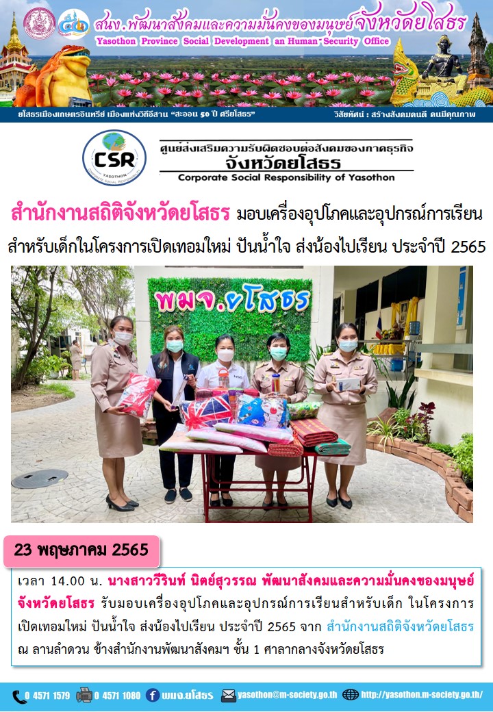 สำนักงานสถิติจังหวัดยโสธร มอบอุปกรณ์การเรียนสำหรับเด็กในโครงการเปิดเทอมใหม่ ปันน้ำใจ ส่งน้องไปเรียน ประจำปี 2565 (23 พฤษภาคม 2565)