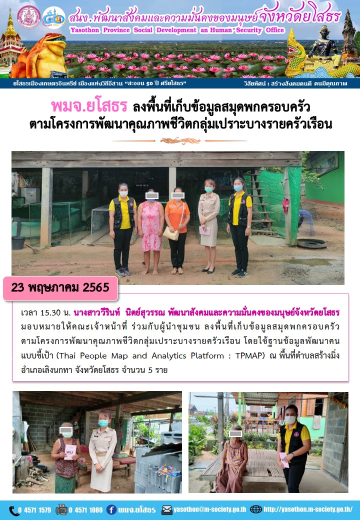 พมจ.ยโสธร ลงพื้นที่เก็บสมุดพกครอบครัวตามโครงการพัฒนาคุณภาพชีวิตกลุ่มเปราะบางรายครัวเรือน (23 พฤษภาคม 2565)