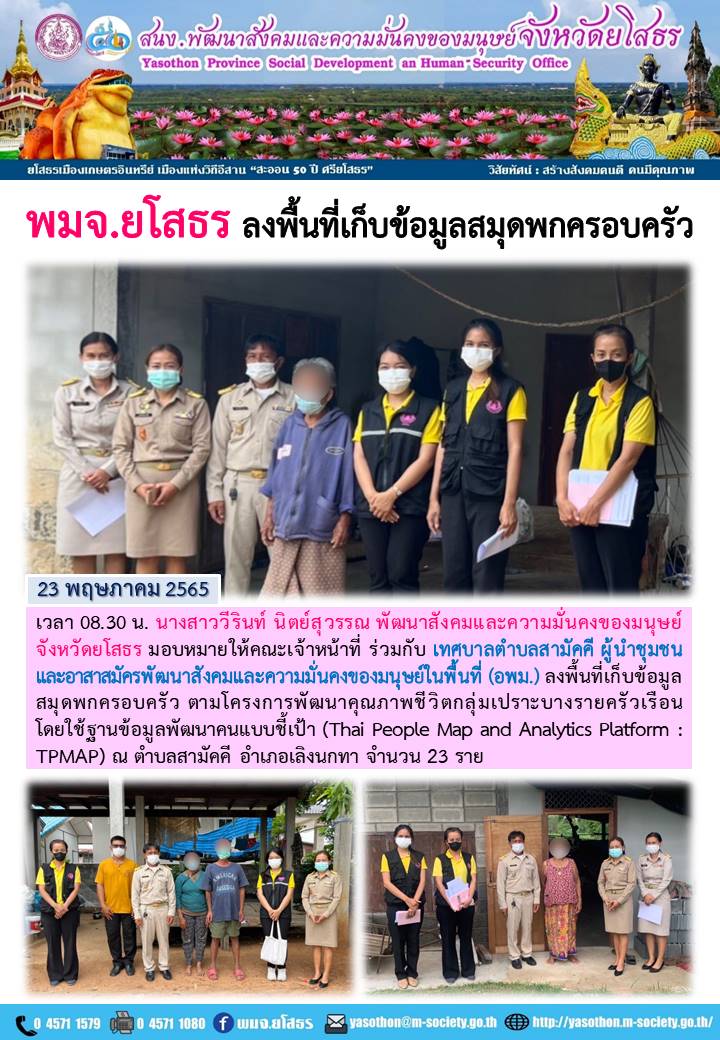 วันที่ 30 พ.ค. 2565 (22:07 น.)วันที่ 23 พฤษภาคม 2565 เวลา 08.30 น. นางสาววีรินท์ นิตย์สุวรรณ พัฒนาสังคมและความมั่นคงของมนุษย์จังหวัดยโสธร มอบหมายให้คณะเจ้าหน้าที่ ร่วมกับ เทศบาลตำบลสามัคคี ผู้นำชุมชน และอาสาสมัครพัฒนาสังคมและความมั่นคงของมนุษย์ในพื้นที่ (อพม.) ลงพื้นที่เก็บข้อมูลสมุดพกครอบครัว ตามโครงการพัฒนาคุณภาพชีวิตกลุ่มเปราะบางรายครัวเรือน โดยใช้ฐานข้อมูลพัฒนาคนแบบชี้เป้า (Thai People Map and Analytics Platform :TPMAP) ณ ตำบลสามัคคี อำเภอเลิงนกทา จำนวน 23 ราย