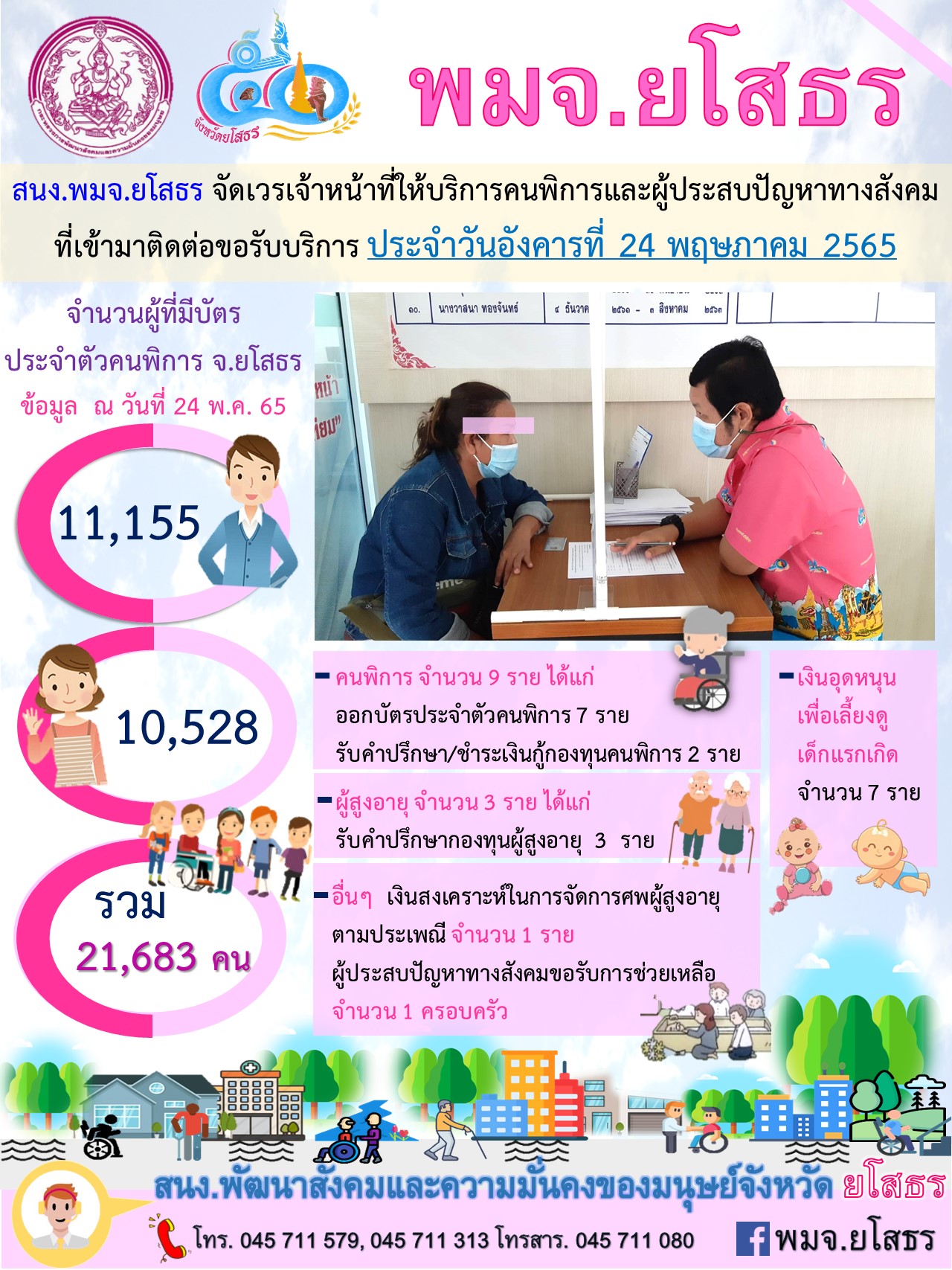 สนง.พมจ.ยโสธร จัดเวรเจ้าหน้าที่ให้บริการคนพิการและผู้ประสบปัญหาทางสังคม ที่เข้ามาติดต่อขอรับบริการ (24 พฤษภาคม 2565)