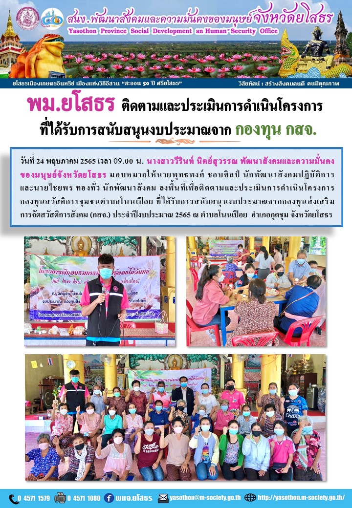 พม.ยโสธร ลงพื้นที่ติดตามและประเมินการดำเนินโครงการที่ได้รับการสนับสนุนงบประมาณจากกองทุน ส่งเสริมการจัดสวัสดิการสังคม (กสจ.) (24 พฤษภาคม 2565)