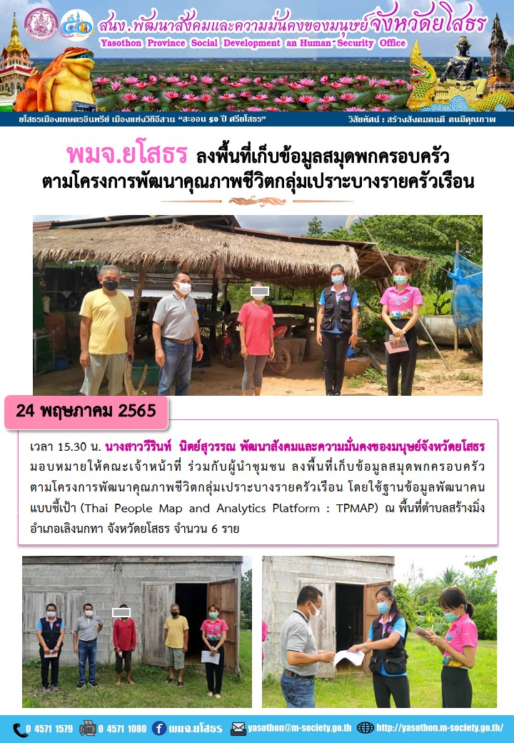 วันที่ 30 พ.ค. 2565 (22:25 น.)วันที่ 24 พฤษภาคม 2565เวลา 15.30 น. นางสาววีรินท์ นิตย์สุวรรณ พัฒนาสังคมและความมั่นคงของมนุษย์จังหวัดยโสธร มอบหมายให้คณะเจ้าหน้าที่ ร่วมกับผู้นำชุมชน ลงพื้นที่เก็บข้อมูลสมุดพกครอบครัว ตามโครงการพัฒนาคุณภาพชีวิตกลุ่มเปราะบางรายครัวเรือน โดยใช้ฐานข้อมูลพัฒนาคนแบบชี้เป้า (Thai People Map and Analytics Platform : TPMAP) ณ พื้นที่ตำบลสร้างมิ่ง อำเภอเลิงนกทา จำนวน 6 ราย