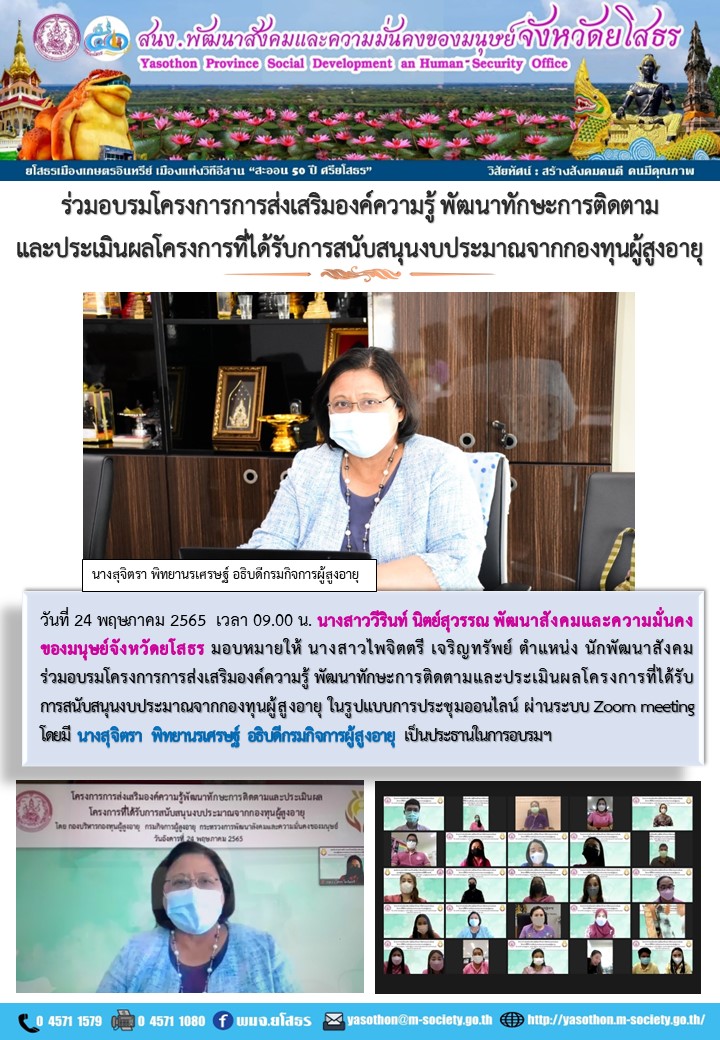 ร่วมอบรมโครงการการส่งเสริมองค์ความรู้ พัฒนาทักษะการติดตามและประเมินผลโครงการที่ได้รับการสนับสนุนงบประมาณจากกองทุนผู้สูงอายุ (24 พฤษภาคม 2565)