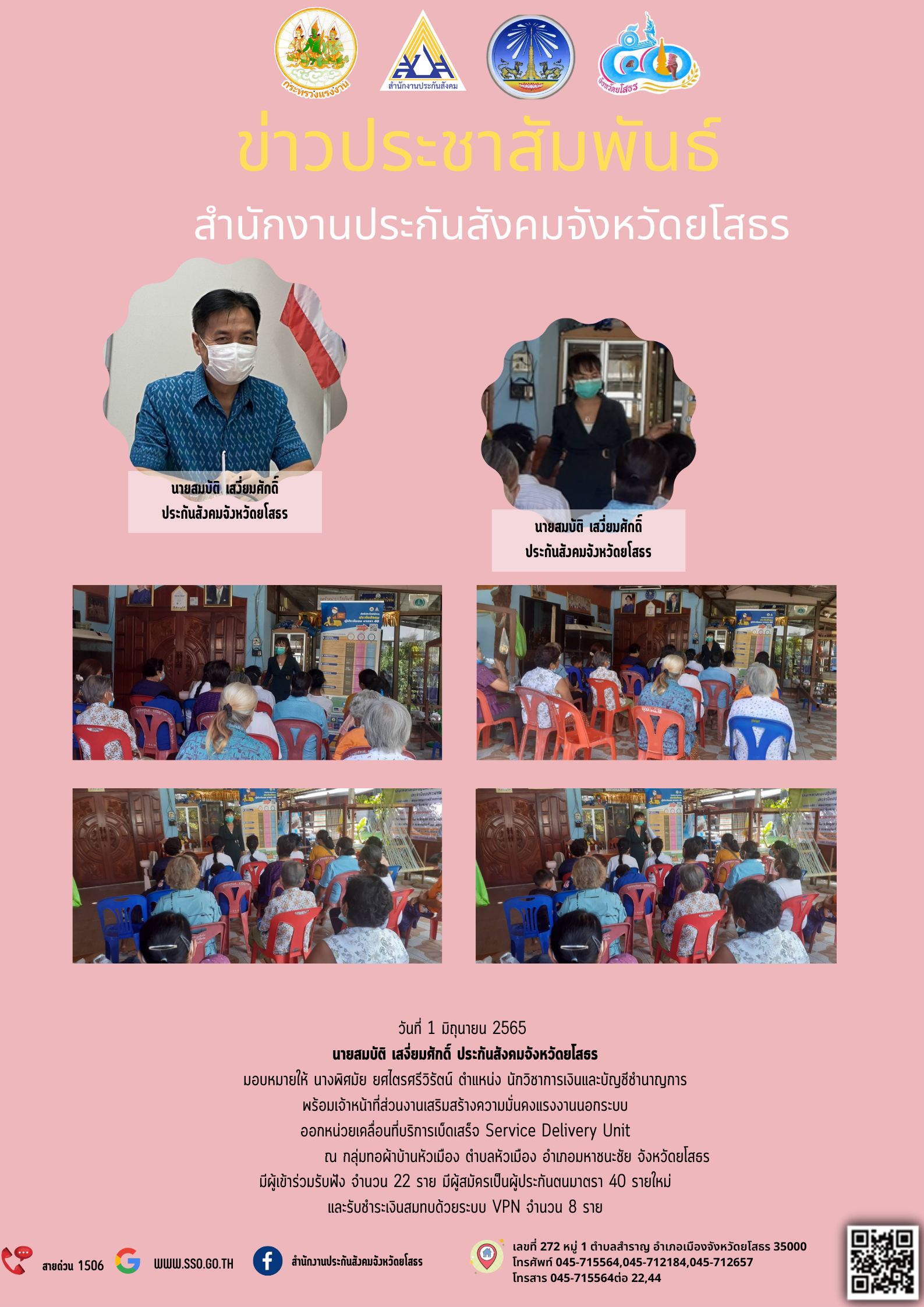 วันที่ 1 มิถุนายน 2565 นายสมบัติ เสงี่ยมศักดิ์ ประกันสังคมจังหวัดยโสธร มอบหมายให้ นางพิศมัย ยศไตรศรีวิรัตน์ ตำแหน่ง นักวิชาการเงินและบัญชีชำนาญการ พร้อมเจ้าหน้าที่ส่วนงานเสริมสร้างความมั่นคงแรงงานนอกระบบ ออกหน่วยเคลื่อนที่บริการเบ็ดเสร็จ Service