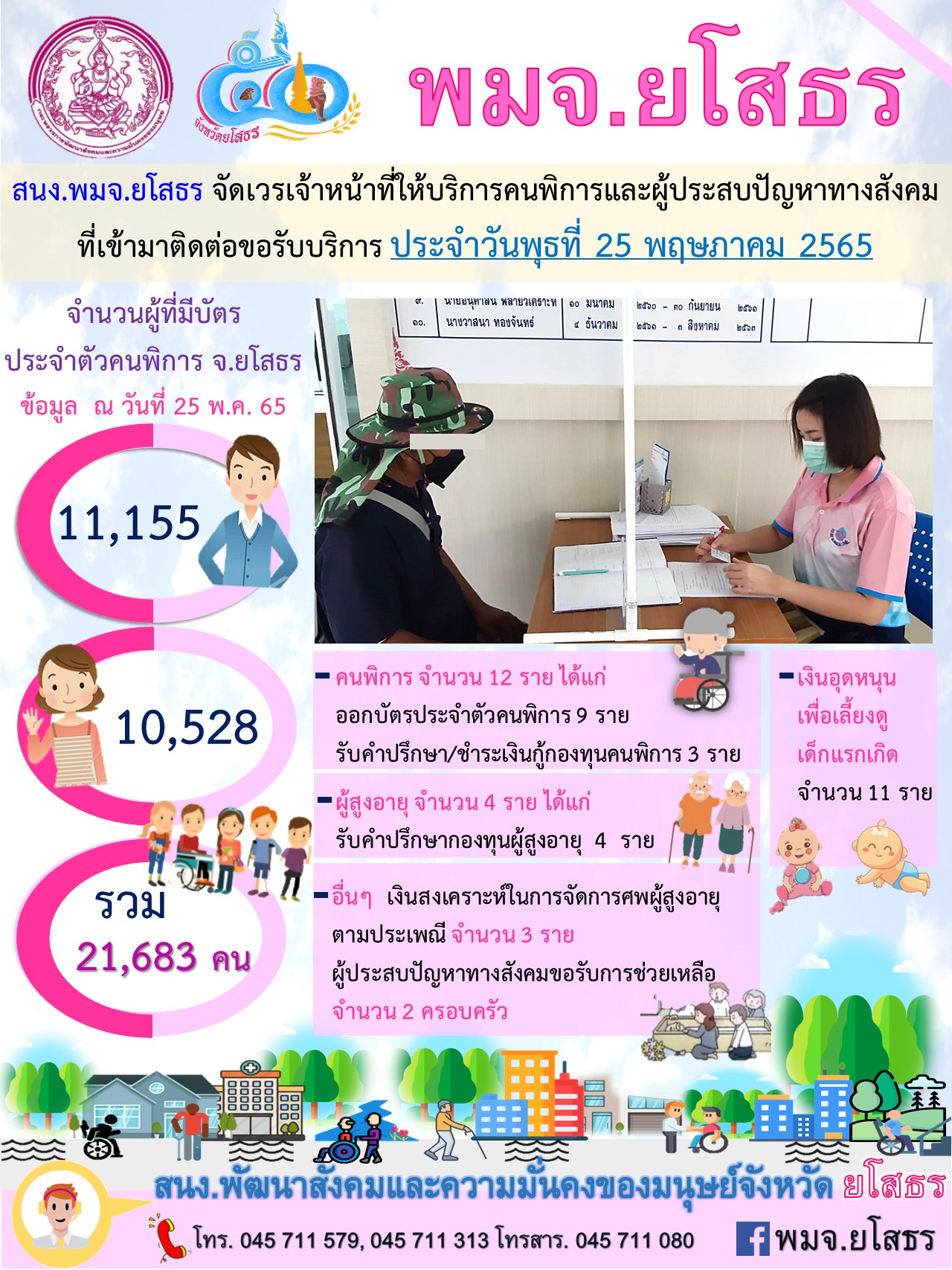 สนง.พมจ.ยโสธร จัดเวรเจ้าหน้าที่ให้บริการคนพิการและผู้ประสบปัญหาทางสังคม ที่เข้ามาติดต่อขอรับบริการ (25 พฤษภาคม 2565)