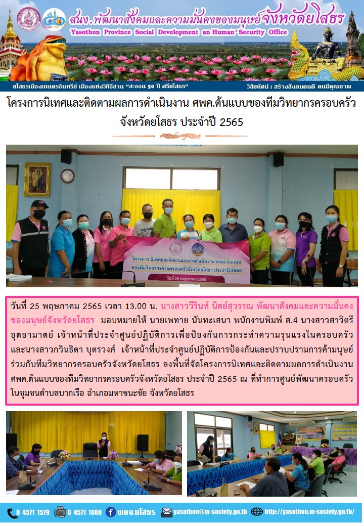 โครงการนิเทศและติดตามผลการดำเนินงาน ศพค.ต้นแบบของทีมวิทยากรครอบครัวจังหวัดยโสธร ประจำปี 2565 ณ ที่ทำการศูนย์พัฒนาครอบครัว ตำบลบากเรือ อำเภอมหาชนะชัย (25 พฤษภาคม 2565)