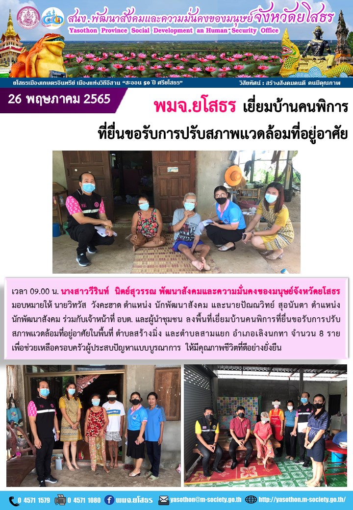 พมจ.ยโสธร เยี่ยมบ้านคนพิการที่ยื่นขอรับการปรับสภาพแวดล้อมที่อยู่อาศัย (26 พฤษภาคม 2565)