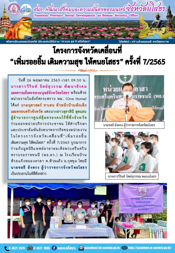 โครงการจังหวัดเคลื่อนที่ "เพิ่มรอยยิ้ม เติมความสุข ให้คนยโสธร" ครั้งที่ 7/2565 (26 พฤษภาคม 2565)