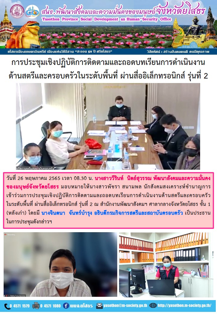 การประชุมเชิงปฏิบัติการติดตามและถอดบทเรียนการดำเนินงานด้านสตรีและครอบครัวในระดับพื้นที่ผ่านสื่ออิเล็กทรอนิกส์รุ่นที่ 2 (26 พฤษภาคม 2565)