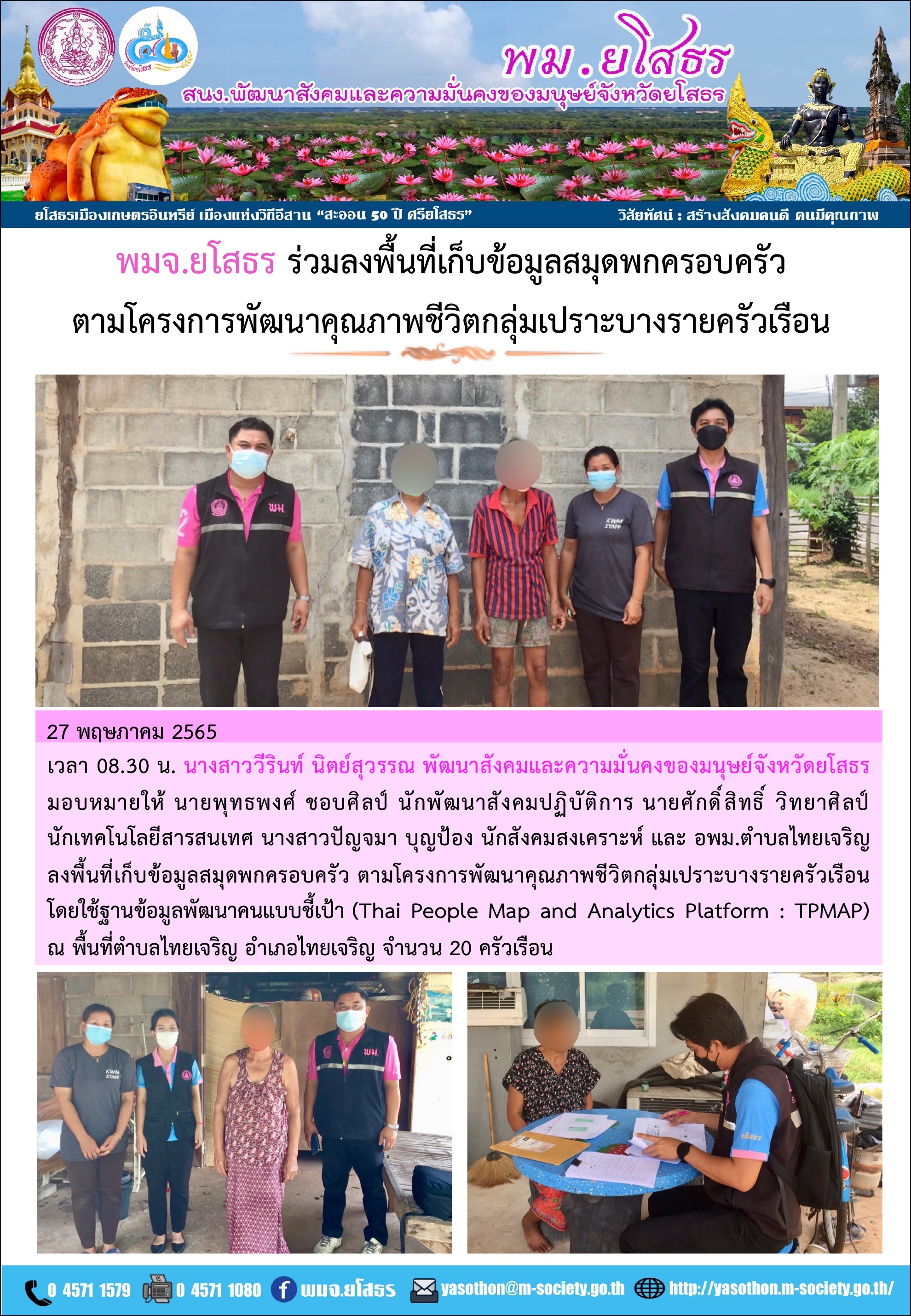 วันที่ 1 มิ.ย. 2565 (20:56 น.)วันที่ 27 พฤษภาคม 2565 เวลา 08.30 น. นางสาววีรินท์ นิตย์สุวรรณ พัฒนาสังคมและความมั่นคงของมนุษย์จังหวัดยโสธร มอบหมายให้ นายพุทธพงศ์ ชอบศิลป์ นักพัฒนาสังคมปฏิบัติการ นายศักดิ์สิทธิ์ วิทยาศิลป์ นักเทคโนโลยีสารสนเทศ นางสาวปัญจมา บุญป้อง นักสังคมสงเคราะห์ และ อพม.ตำบลไทยเจริญ ลงพื้นที่เก็บข้อมูลสมุดพกครอบครัว ตามโครงการพัฒนาคุณภาพชีวิตกลุ่มเปราะบางรายครัวเรือน โดยใช้ฐานข้อมูลพัฒนาคนแบบชี้เป้า (Thai People Map and Analytics Platform : TPMAP) ณ พื้นที่ตำบลไทยเจริญ อำเภอไทยเจริญ จำนวน 20 ครัวเรือน