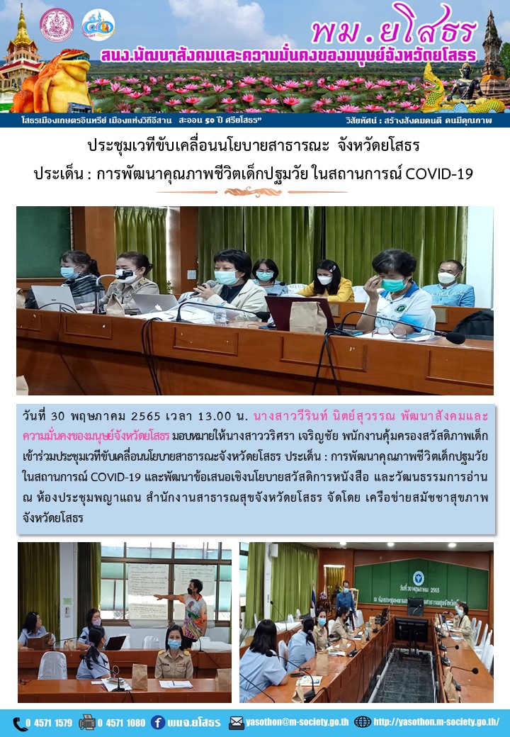 ประชุมเวทีขับเคลื่อนนโยบายสาธารณะจังหวัดยโสธร ประเด็น การพัฒนาคุณภาพชีวิตเด็กปฐมวัยในสถานการณ์ COVID-19 (30 พฤษภาคม 2565)