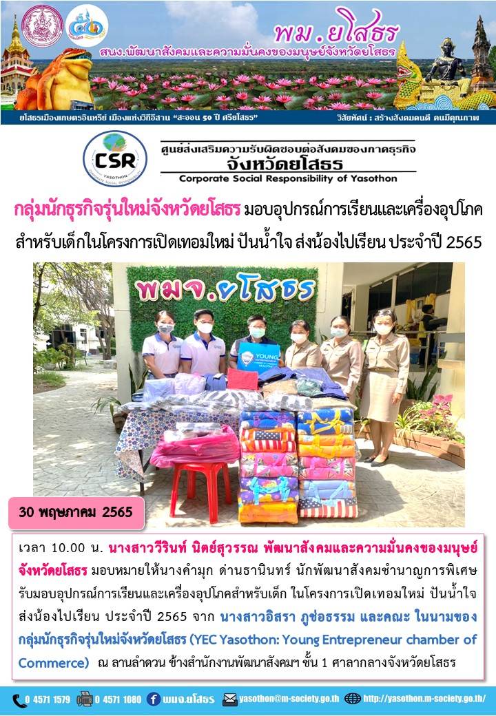กลุ่มนักธุรกิจรุ่นใหม่จังหวัดยโสธร มอบอุปกรณ์การเรียนและเครื่องอุปโภคสำหรับเด็กในโครงการเปิดเทอมใหม่ ปันน้ำใจ ส่งน้องไปเรียน ประจำปี 2565 (30 พฤษภาคม 2565)