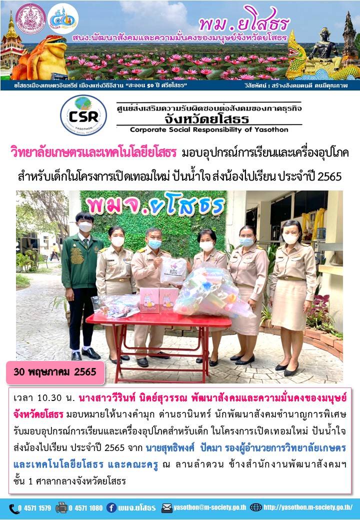วิทยาลัยเกษตรและเทคโนโลยียโสธ มอบอุปกรณ์การเรียนและเครื่องอุปโภคสำหรับเด็กในโครงการเปิดเทอมใหม่ ปันน้ำใจ ส่งน้องไปเรียน ประจำปี 2565 (30 พฤษภาคม 2565)