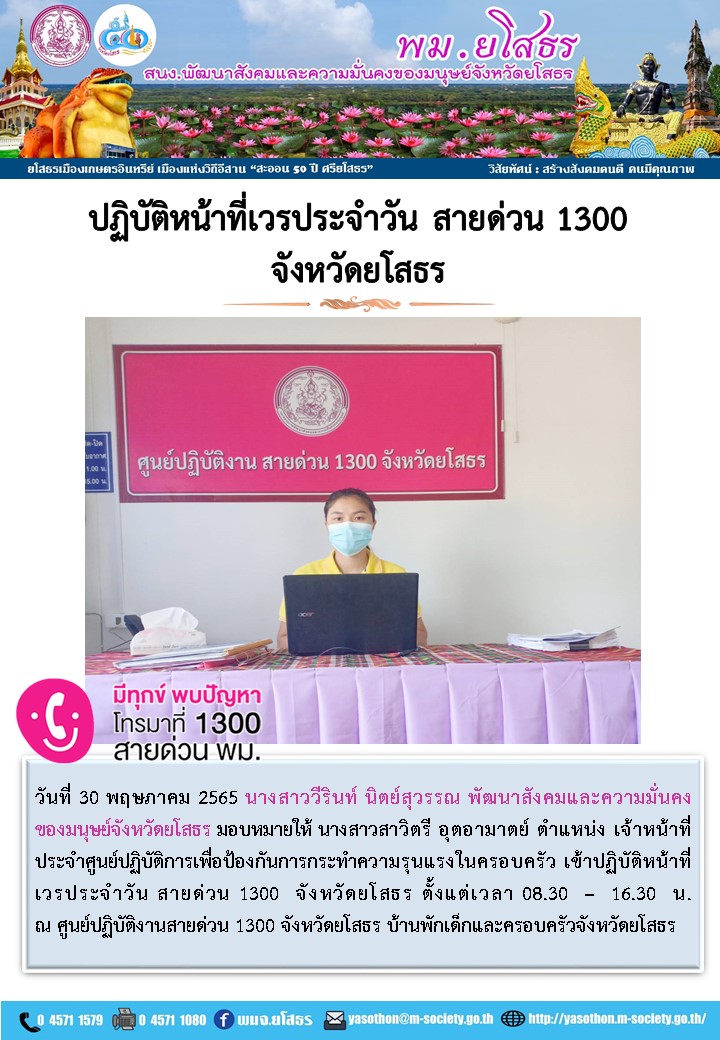 ปฏิบัติหน้าที่เวรประจำวันสายด่วน 1300 จังหวัดยโสธร (30 พฤษภาคม 2565)