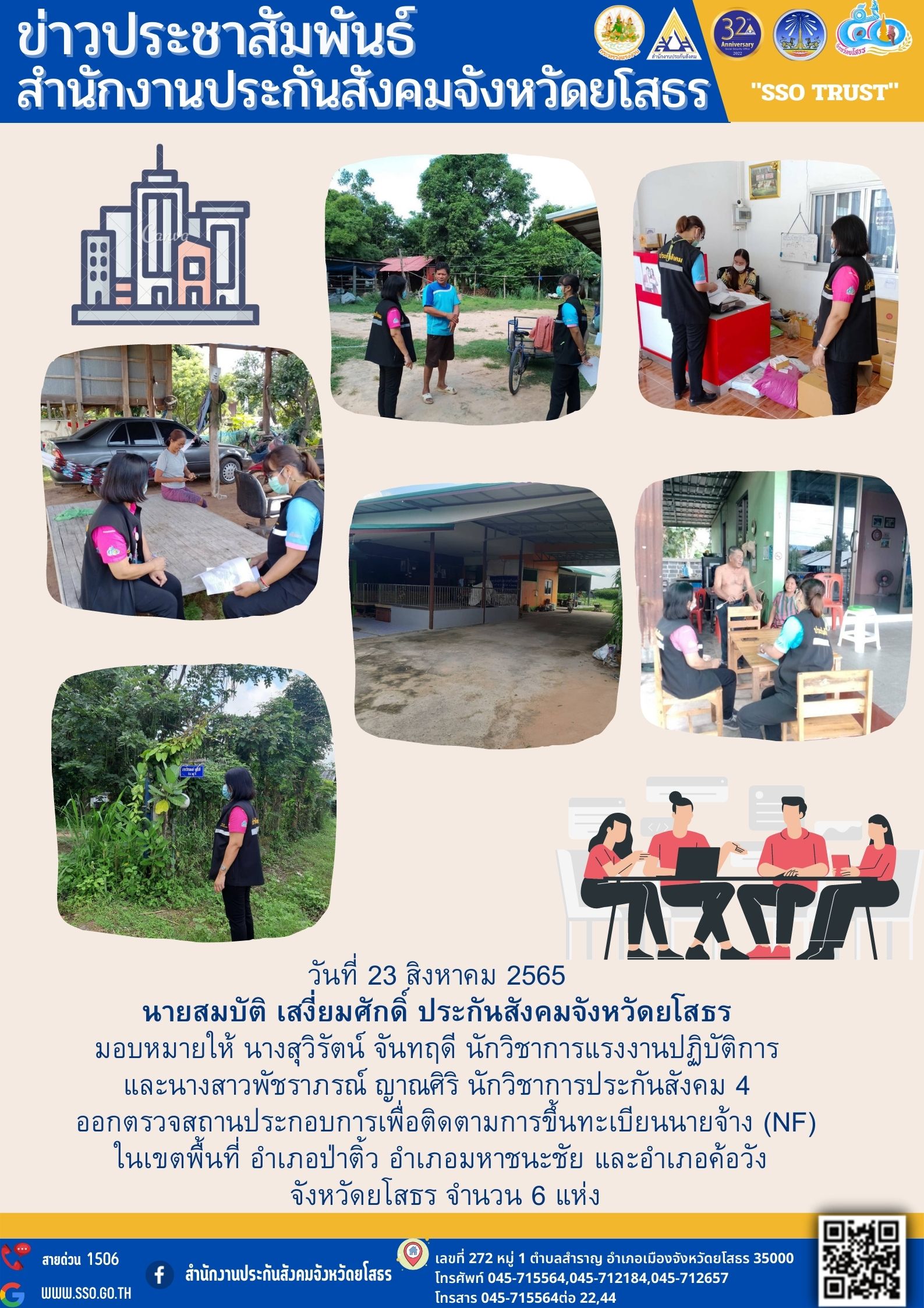วันที่ 9 มิถุนายน 2565 นายสมบัติ เสงี่ยมศักดิ์ ประกันสังคมจังหวัดยโสธร มอบหมายให้ นางพิศมัย ยศไตรศรีวิรัตน์ ตำแหน่ง นักวิชาการเงินและบัญชีชำนาญการ พร้อมเจ้าหน้าที่ส่วนงานเสริมสร้างความมั่นคงแรงงานนอกระบบ ออกหน่วยเคลื่อนที่บริการเบ็ดเสร็จ Service
