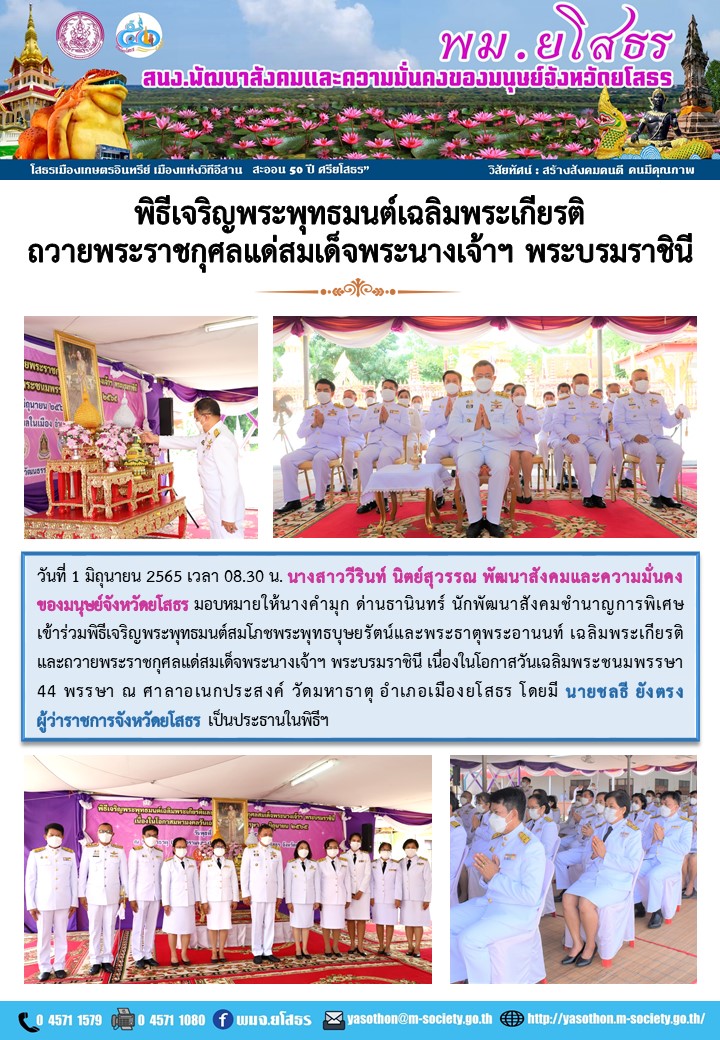 วันที่ 13 มิ.ย. 2565 (20:45 น.)วันที่ 1 มิถุนายน 2565 เวลา 08.30 น. นางสาววีรินท์ นิตย์สุวรรณ พัฒนาสังคมและความมั่นคงของมนุษย์จังหวัดยโสธร มอบหมายให้นางคำมุก ด่านธานินทร์ นักพัฒนาสังคมชำนาญการพิเศษเข้าร่วมพิธีเจริญพระพุทธมนต์สมโภชพระพุทธบุษยรัตน์และพระธาตุพระอานนท์ เฉลิมพระเกียรติและถวายพระราชกุศลแด่สมเด็จพระนางเจ้าฯ พระบรมราชินี เนื่องในโอกาสวันเฉลิมพระชนมพรรษา 44 พรรษา ณ ศาลาอเนกประสงค์ วัดมหาธาตุ อำเภอเมืองยโสธร โดยมี นายชลธี ยังตรง ผู้ว่าราชการจังหวัดยโสธร เป็นประธานในพิธีฯ