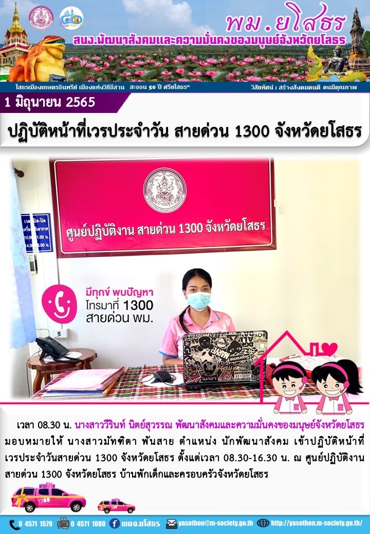 ปฏิบัติหน้าที่เวรประจำวันสายด่วน 1300 จังหวัดยโสธร (1 มิถุนายน 2565)