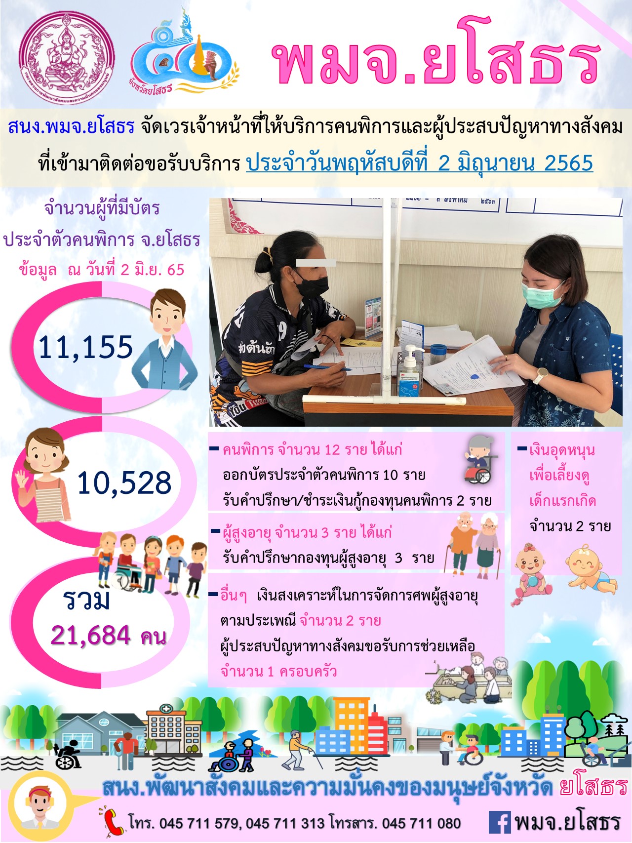 สนง.พมจ.ยโสธร จัดเวรเจ้าหน้าที่ให้บริการคนพิการและผู้ประสบปัญหาทางสังคม ที่เข้ามาติดต่อขอรับบริการ (2 มิถุนายน 2565)