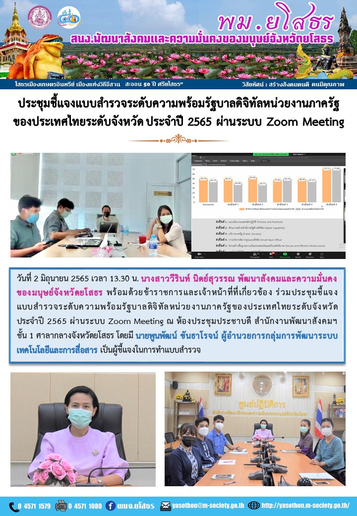 วันที่ 13 มิ.ย. 2565 (20:55 น.)วันที่ 2 มิถุนายน 2565 เวลา 13.30 น. นางสาววีรินท์ นิตย์สุวรรณ พัฒนาสังคมและความมั่นคงของมนุษย์จังหวัดยโสธร พร้อมด้วยข้าราชการและเจ้าหน้าที่ที่เกี่ยวข้อง ร่วมประชุมชี้แจงแบบสำรวจระดับความพร้อมรัฐบาลดิจิทัลหน่วยงานภาครัฐของประเทศไทยระดับจังหวัด ประจำปี 2565 ผ่านระบบ Zoom Meeting ณ ห้องประชุมประชาบดี สำนักงานพัฒนาสังคมฯชั้น 1 ศาลากลางจังหวัดยโสธร โดยมี นายพูนพัฒน์ ขันธาโรจน์ ผู้อำนวยการกลุ่มการพัฒนาระบบเทคโนโลยีและการสื่อสาร เป็นผู้ชี้แจงในการทำแบบสำรวจ