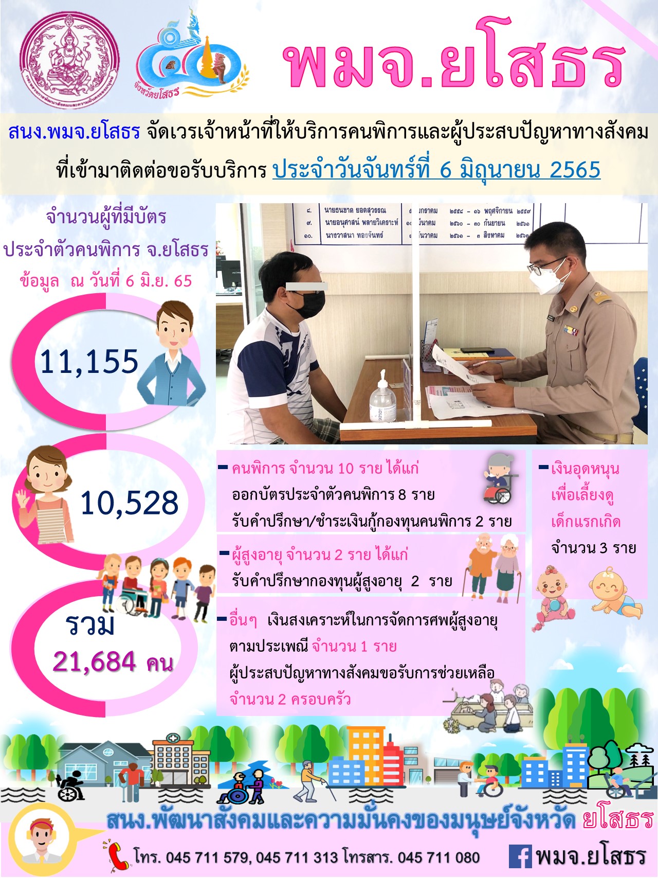 สนง.พมจ.ยโสธร จัดเวรเจ้าหน้าที่ให้บริการคนพิการและผู้ประสบปัญหาทางสังคม ที่เข้ามาติดต่อขอรับบริการ (6 มิถุนายน 2565)