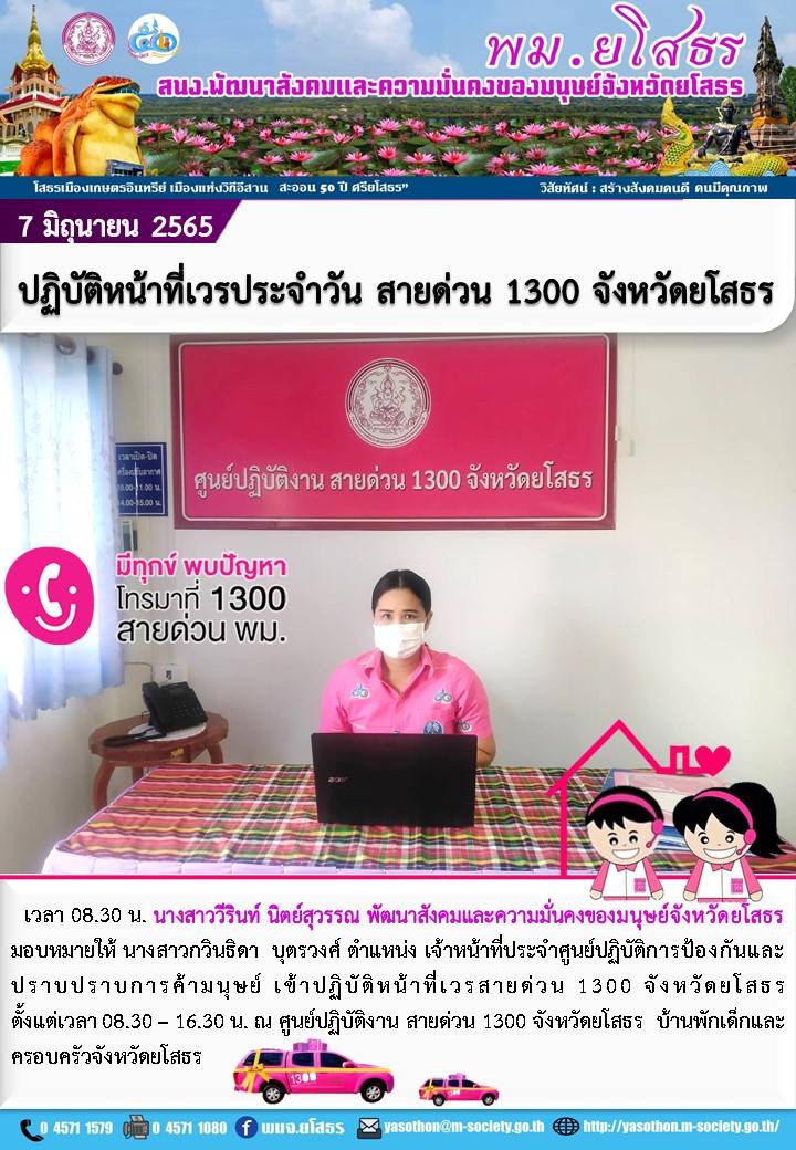 ปฏิบัติหน้าที่เวรประจำวันสายด่วน 1300 จังหวัดยโสธร (7 มิถุนายน 2565)