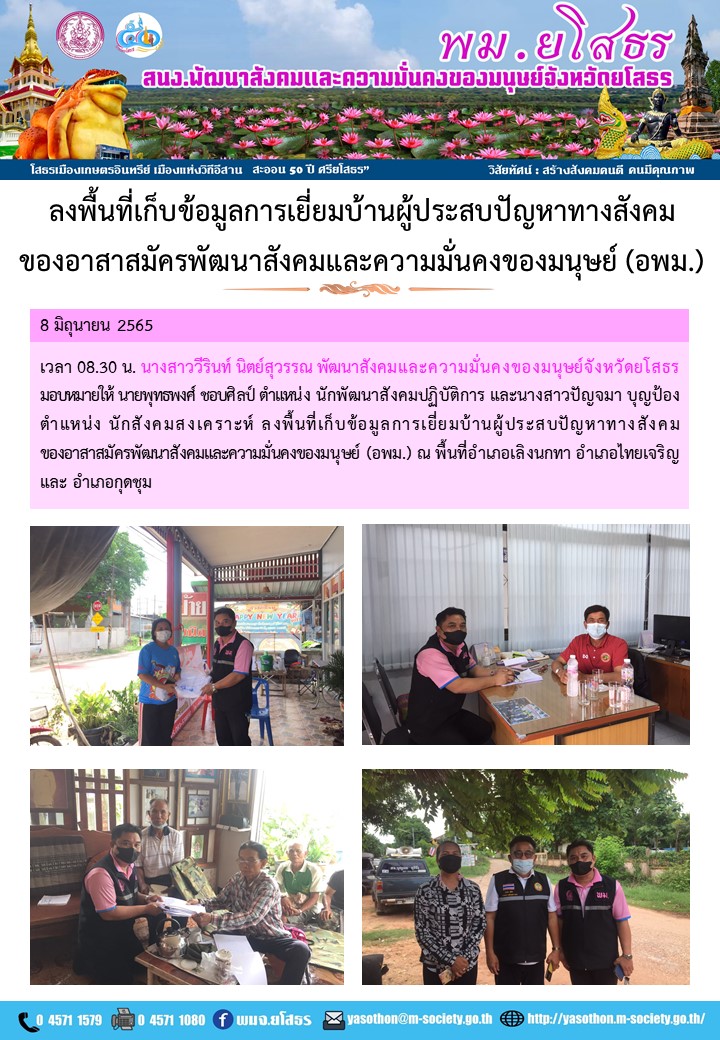 วันที่ 18 มิ.ย. 2565 (20:33 น.)วันที่ 8 มิถุนายน 2565 เวลา 08.30 น. นางสาววีรินท์ นิตย์สุวรรณ พัฒนาสังคมและความมั่นคงของมนุษย์จังหวัดยโสธร มอบหมายให้ นายพุทธพงศ์ ชอบศิลป์ ตำแหน่ง นักพัฒนาสังคมปฏิบัติการ และนางสาวปัญจมา บุญป้อง ตำแหน่ง นักสังคมสงเคราะห์ ลงพื้นที่เก็บข้อมูลการเยี่ยมบ้านผู้ประสบปัญหาทางสังคม ของอาสาสมัครพัฒนาสังคมและความมั่นคงของมนุษย์ (อพม.) ณ พื้นที่อำเภอเลิงนกทา อำเภอไทยเจริญ และ อำเภอกุดชุม