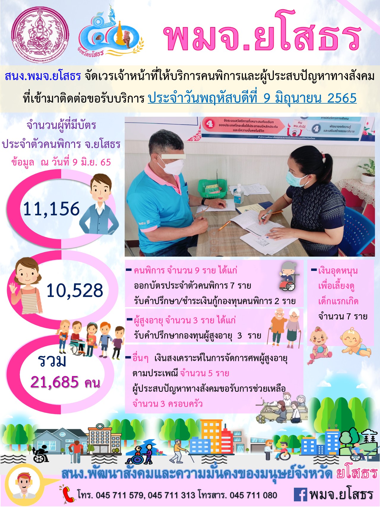 สนง.พมจ.ยโสธร จัดเวรเจ้าหน้าที่ให้บริการคนพิการและผู้ประสบปัญหาทางสังคม ที่เข้ามาติดต่อขอรับบริการ (9 มิถุนายน 2565)