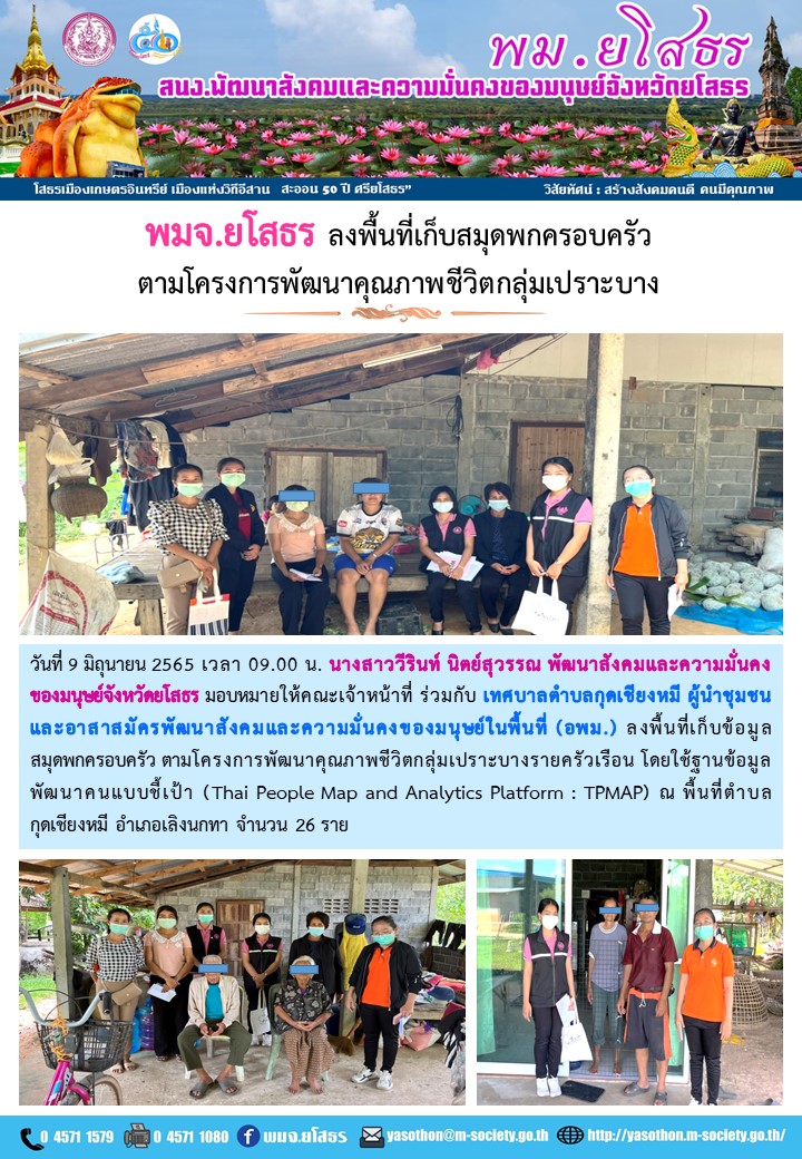 วันที่ 18 มิ.ย. 2565 (20:48 น.)วันที่ 9 มิถุนายน 2565 เวลา 09.00 น. นางสาววีรินท์ นิตย์สุวรรณ พัฒนาสังคมและความมั่นคงของมนุษย์จังหวัดยโสธร มอบหมายให้คณะเจ้าหน้าที่ ร่วมกับ เทศบาลตำบลกุดเชียงหมี ผู้นำชุมชน และอาสาสมัครพัฒนาสังคมและความมั่นคงของมนุษย์ในพื้นที่ (อพม.) ลงพื้นที่เก็บข้อมูลสมุดพกครอบครัว ตามโครงการพัฒนาคุณภาพชีวิตกลุ่มเปราะบางรายครัวเรือน โดยใช้ฐานข้อมูลพัฒนาคนแบบชี้เป้า (Thai People Map and Analytics Platform : TPMAP) ณ พื้นที่ตำบลกุดเชียงหมี อำเภอเลิงนกทา จำนวน 26 ราย