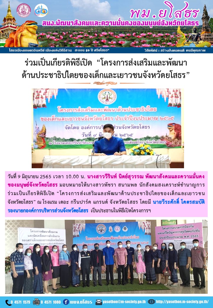 ร่วมเป็นเกียรติพิธีเปิด “โครงการส่งเสริมและพัฒนาด้านประชาธิปไตยของเด็กและเยาวชน จังหวัดยโสธร” (9 มิถุนายน 2565)
