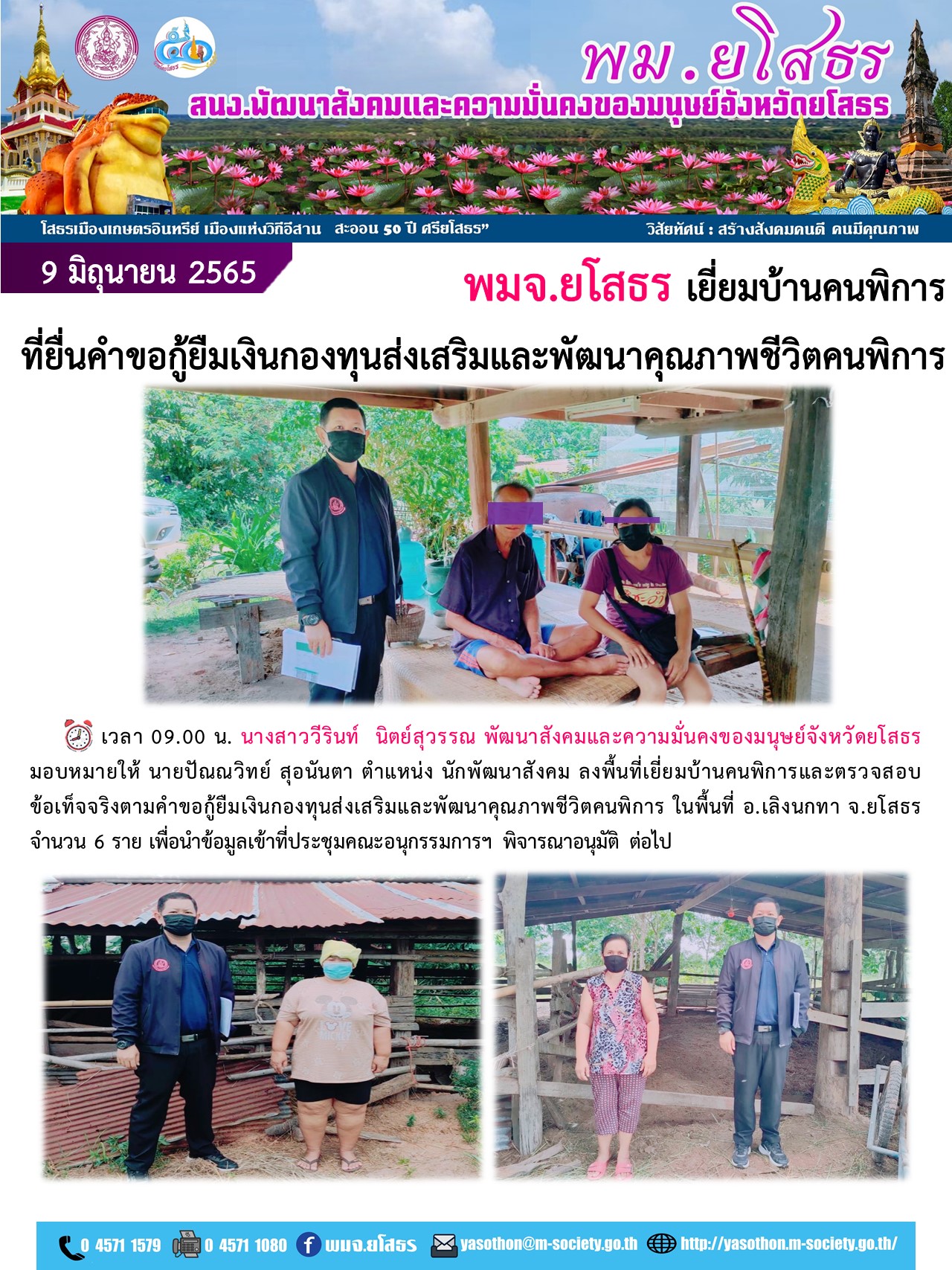 พมจ.ยโสธร เยี่ยมบ้านคนพิการที่ขอกู้ยืมเงินกองทุนส่งเสริมและพัฒนาคุณภาพชีวิตคนพิการ (9 มิถุนายน 2565)