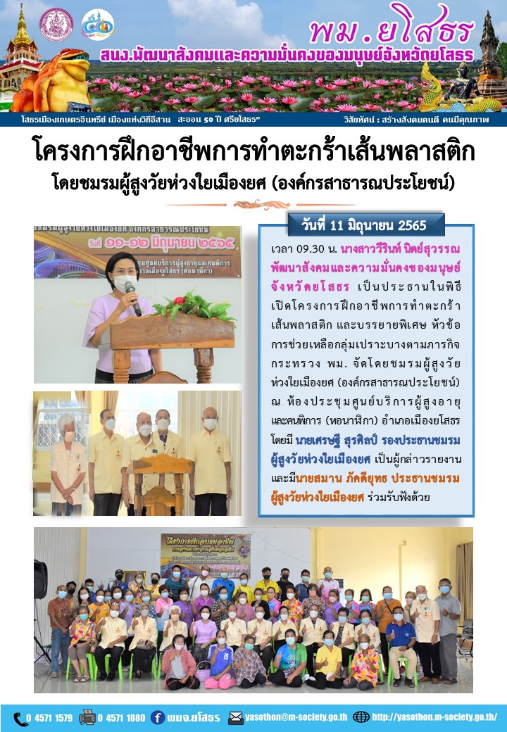 วันที่ 18 มิ.ย. 2565 (21:21 น.)วันที่ 11 มิถุนายน 2565 เวลา 09.30 น. นางสาววีรินท์ นิตย์สุวรรณ พัฒนาสังคมและความมั่นคงของมนุษย์จังหวัดยโสธร เป็นประธานในพิธีเปิดโครงการฝึกอาชีพการทำตะกร้าเส้นพลาสติก และบรรยายพิเศษ หัวข้อการช่วยเหลือกลุ่มเปราะบางตามภารกิจกระทรวง พม. จัดโดยชมรมผู้สูงวัยห่วงใยเมืองยศ (องค์กรสาธารณประโยชน์) ณ ห้องประชุมศูนย์บริการผู้สูงอายุและคนพิการ (หอนาฬิกา) อำเภอเมืองยโสธร โดยมี นายเศรษฐี สุรศิลป์ รองประธานชมรมผู้สูงวัยห่วงใยเมืองยศ เป็นผู้กล่าวรายงาน และมีนายสมาน ภัคดียุทธ ประธานชมรมผู้สูงวัยห่วงใยเมืองยศ ร่วมรับฟังด้วย