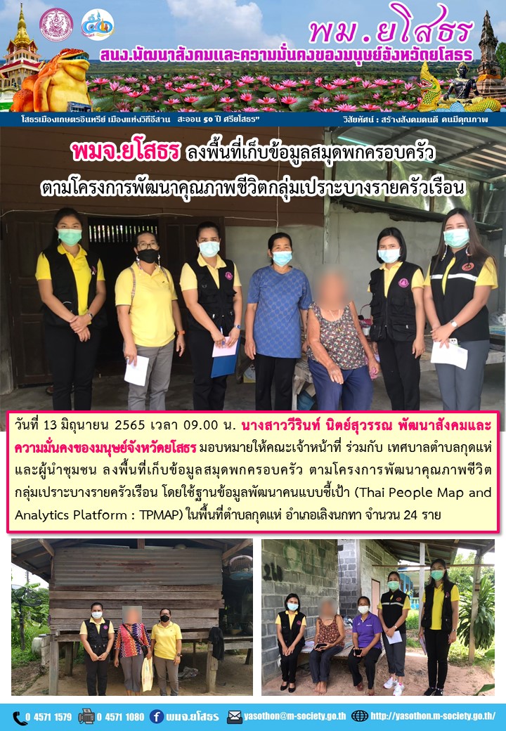 วันที่ 19 มิ.ย. 2565 (13:11 น.)วันที่ 13 มิถุนายน 2565 เวลา 09.00 น. นางสาววีรินท์ นิตย์สุวรรณ พัฒนาสังคมและ ความมั่นคงของมนุษย์จังหวัดยโสธร มอบหมายให้คณะเจ้าหน้าที่ ร่วมกับ องค์การบริหาร ส่วนตำบลกุดแห่ ผู้นำชุมชน และอาสาสมัครพัฒนาสังคมและความมั่นคงของมนุษย์ในพื้นที่ (อพม.) ลงพื้นที่เก็บข้อมูลสมุดพกครอบครัว ตามโครงการพัฒนาคุณภาพชีวิตกลุ่มเปราะบางรายครัวเรือน โดยใช้ฐานข้อมูลพัฒนาคนแบบชี้เป้า (Thai People Map and Analytics Platform : TPMAP) ในพื้นที่ตำบลกุดแห่ อำเภอเลิงนกทา จำนวน 24 ราย