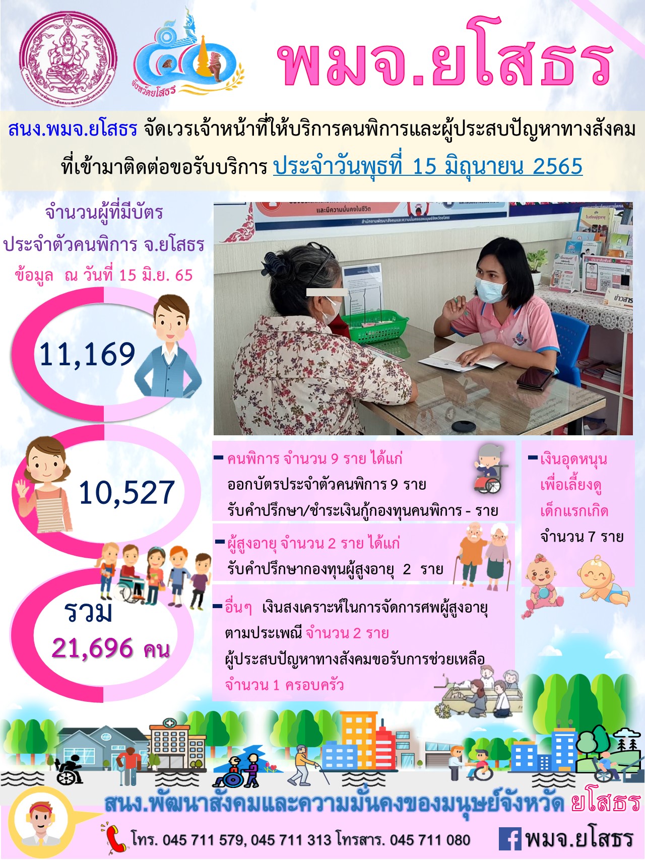 สนง.พมจ.ยโสธร จัดเวรเจ้าหน้าที่ให้บริการคนพิการและผู้ประสบปัญหาทางสังคม ที่เข้ามาติดต่อขอรับบริการ (15 มิถุนายน 2565)