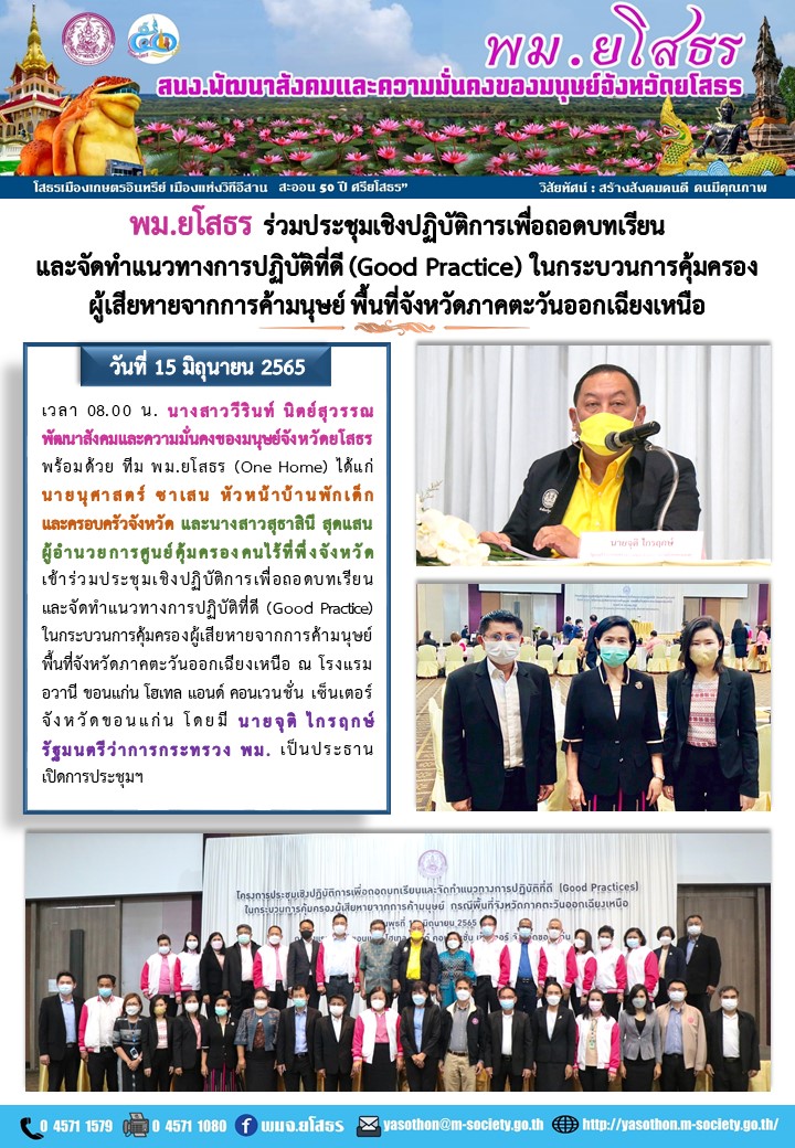 พมจ.ยโสธร ร่วมประชุมเชิงปฏิบัติการเพื่อถอดบทเรียน และจัดทำแนวทางการปฏิบัติที่ดี (Good Practice) ในกระบวนการคุ้มครองผู้เสียหายจากการค้ามนุษย์ พื้นที่จังหวัดภาคตะวันออกเฉียงเหนือ (15 มิถุนายน 2565)