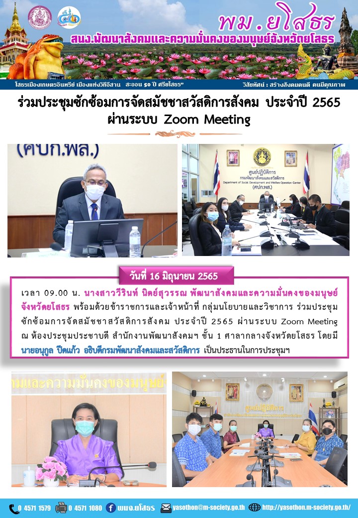 วันที่ 20 มิ.ย. 2565 (20:29 น.)วันที่ 16 มิถุนายน 2565 เวลา 09.00 น. นางสาววีรินท์ นิตย์สุวรรณ พัฒนาสังคมและความมั่นคงของมนุษย์จังหวัดยโสธร พร้อมด้วยข้าราชการและเจ้าหน้าที่ กลุ่มนโยบายและวิชาการ ร่วมประชุมซักซ้อมการจัดสมัชชาสวัสดิการสังคม ประจำปี 2565 ผ่านระบบ Zoom Meeting ณ ห้องประชุมประชาบดี สำนักงานพัฒนาสังคมฯ ชั้น 1 ศาลากลางจังหวัดยโสธร โดยมี นายอนุกูล ปีดแก้ว อธิบดีกรมพัฒนาสังคมและสวัสดิการ เป็นประธานในการประชุมฯ