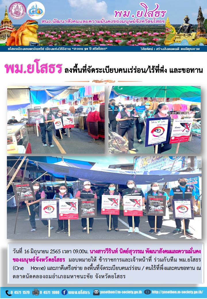 วันที่ 20 มิ.ย. 2565 (20:36 น.)วันที่ 16 มิถุนายน 2565 เวลา 09.00น. นางสาววีรินท์ นิตย์สุวรรณ พัฒนาสังคมและความมั่นคงของมนุษย์จังหวัดยโสธร มอบหมายให้ ข้าราชการและเจ้าหน้าที่ ร่วมกับทีม พม.ยโสธร (One Home และภาคีเครื่อข่าย ลงพื้นที่จัดระเบียบคนเร่ร่อน / คนไร้ที่พึ่งและคนขอทาน ณ ตลาดนัดคลองถมอำเภอมหาชนะชัย จังหวัดยโสธร