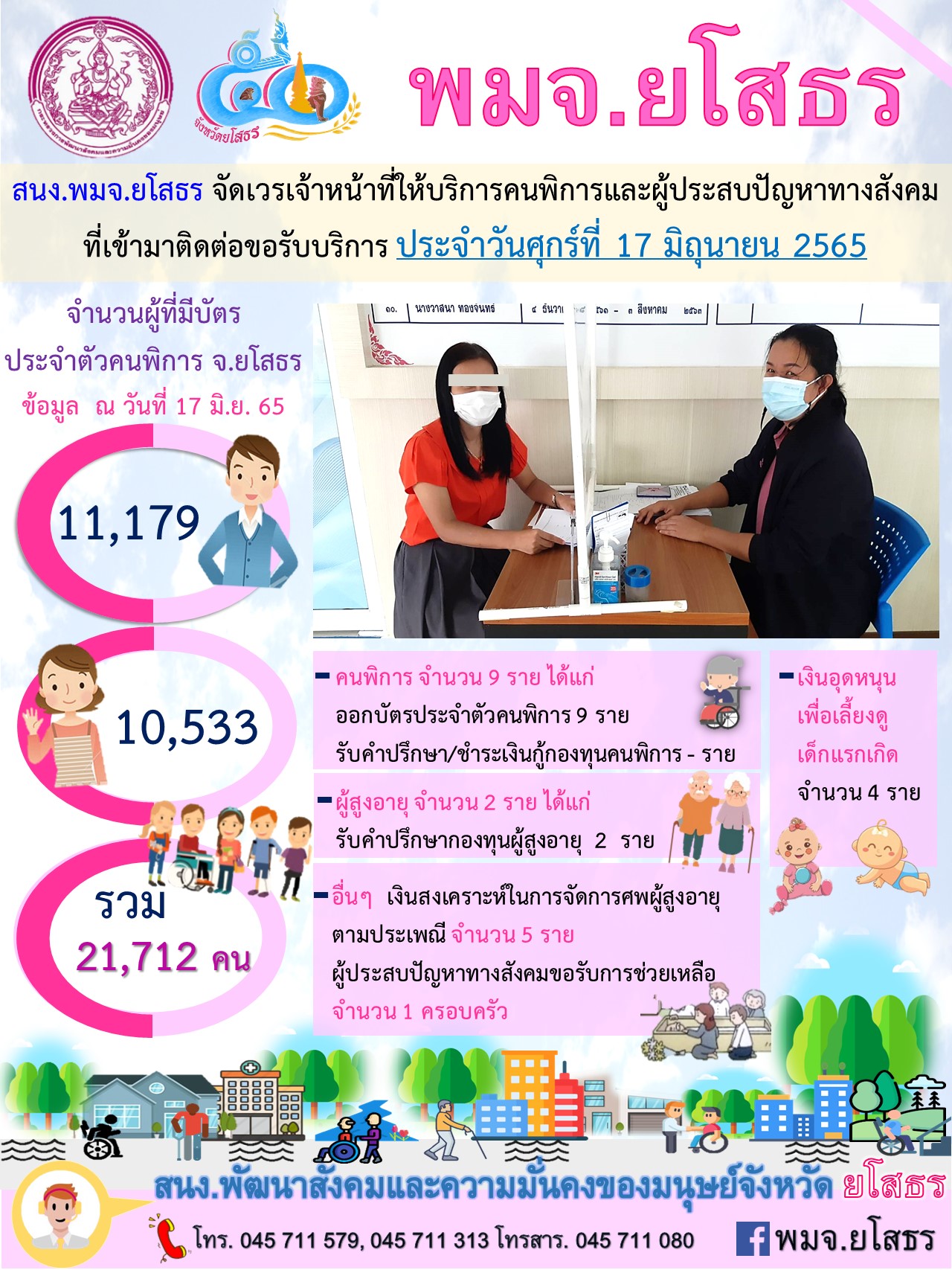 สนง.พมจ.ยโสธร จัดเวรเจ้าหน้าที่ให้บริการคนพิการและผู้ประสบปัญหาทางสังคม ที่เข้ามาติดต่อขอรับบริการ (17 มิถุนายน 2565)