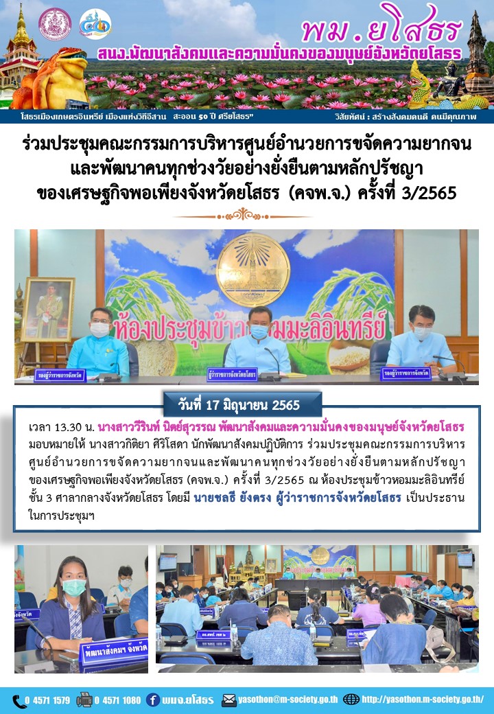 ร่วมประชุมคณะกรรมการบริหาร ศูนย์อำนวยการขจัดความยากจนและพัฒนาคนทุกช่วงวัยอย่างยั่งยืนตามหลักปรัชญาของเศรษฐกิจพอเพียงจังหวัดยโสธร (คจพ.จ.) ครั้งที่ 3/2565 (17 มิถุนายน 2565)