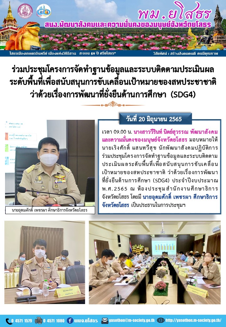 วันที่ 22 มิ.ย. 2565 (20:20 น.)วันที่ 20 มิถุนายน 2565 เวลา 09.00 น. นางสาววีรินท์ นิตย์สุวรรณ พัฒนาสังคมและความมั่นคงของมนุษย์จังหวัดยโสธร มอบหมายให้ นายเริงศักดิ์ แสนทวีสุข นักพัฒนาสังคมปฏิบัติการ ร่วมประชุมโครงการจัดทำฐานข้อมูลและระบบติดตามประเมินผลระดับพื้นที่เพื่อสนับสนุนการขับเคลื่อนเป้าหมายของสหประชาชาติ ว่าด้วยเรื่องการพัฒนาที่ยั่งยืนด้านการศึกษา (SDG4) ประจำปีงบประมาณ พ.ศ.2565 ณ ห้องประชุมสำนักงานศึกษาธิการจังหวัดยโสธร โดยมี นายอุดมศักดิ์ เพชรผา ศึกษาธิการจังหวัดยโสธร เป็นประธานในการประชุมฯ