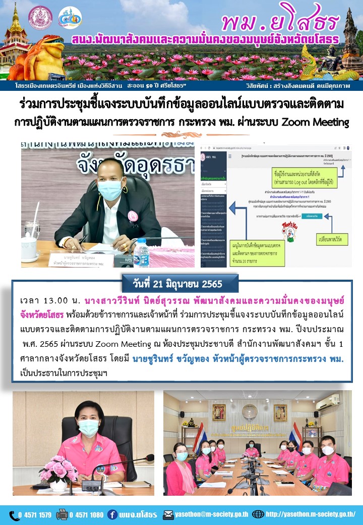 วันที่ 22 มิ.ย. 2565 (20:35 น.)วันที่ 21 มิถุนายน 2565 เวลา 13.00 น. นางสาววีรินท์ นิตย์สุวรรณ พัฒนาสังคมและความมั่นคงของมนุษย์จังหวัดยโสธร พร้อมด้วยข้าราชการและเจ้าหน้าที่ ร่วมการประชุมชี้แจงระบบบันทึกข้อมูลออนไลน์แบบตรวจและติดตามการปฏิบัติงานตามแผนการตรวจราชการ กระทรวง พม. ปีงบประมาณ พ.ศ. 2565 ผ่านระบบ Zoom Meeting ณ ห้องประชุมประชาบดี สำนักงานพัฒนาสังคมฯ ชั้น 1 ศาลากลางจังหวัดยโสธร โดยมี นายชูรินทร์ ขวัญทอง หัวหน้าผู้ตรวจราชการกระทรวง พม. เป็นประธานในการประชุมฯ